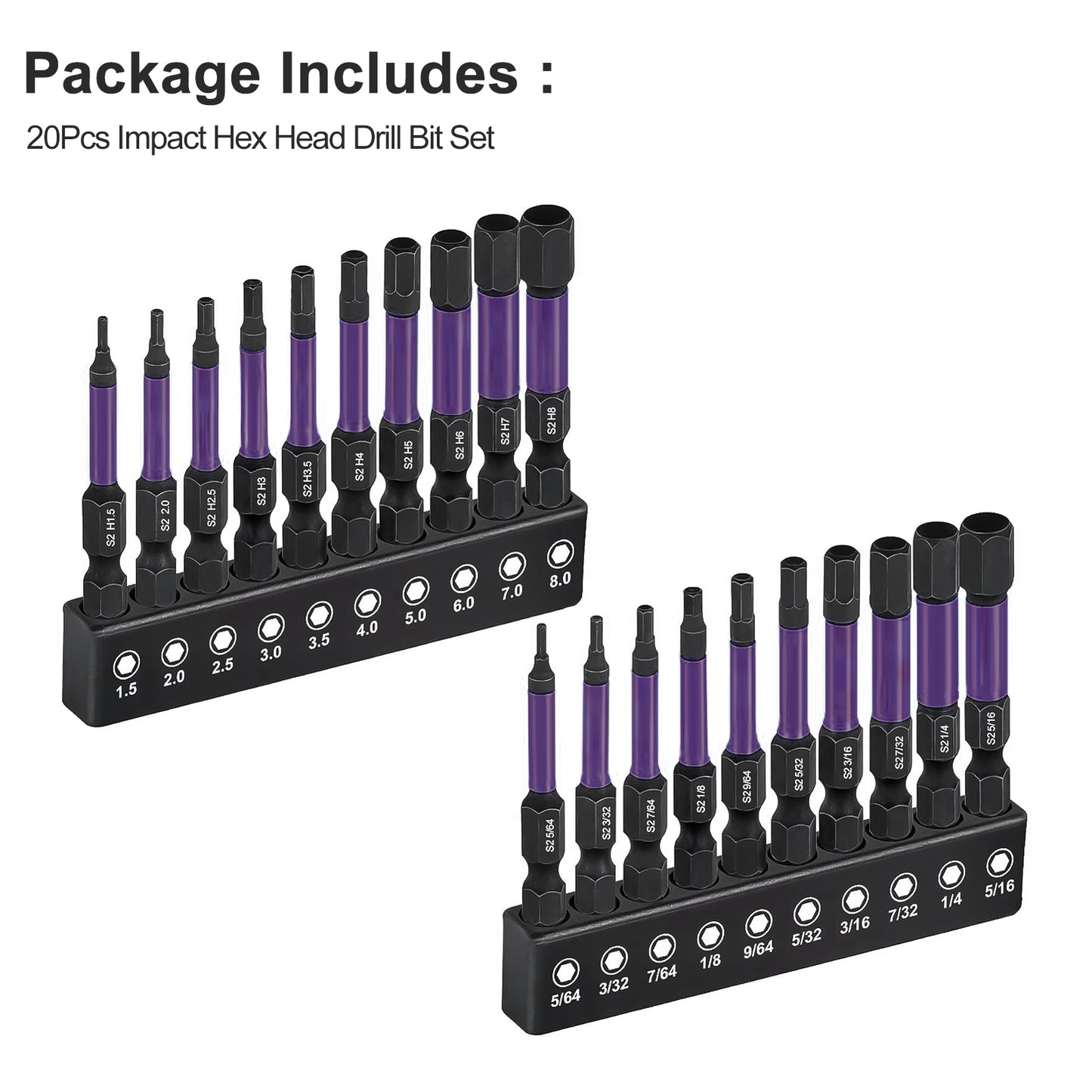 Perfect for DIY enthusiasts and professionals alike, our 20Pcs Impact Hex Head Drill Bit Set is a comprehensive collection that meets a wide range of fastening and drilling needs. This set includes 10 metric sizes ranging from 1.5mm to 8mm and 10 SAE sizes from 5/64” to 5/16”, with a uniform 50mm length for convenient use across various tasks.