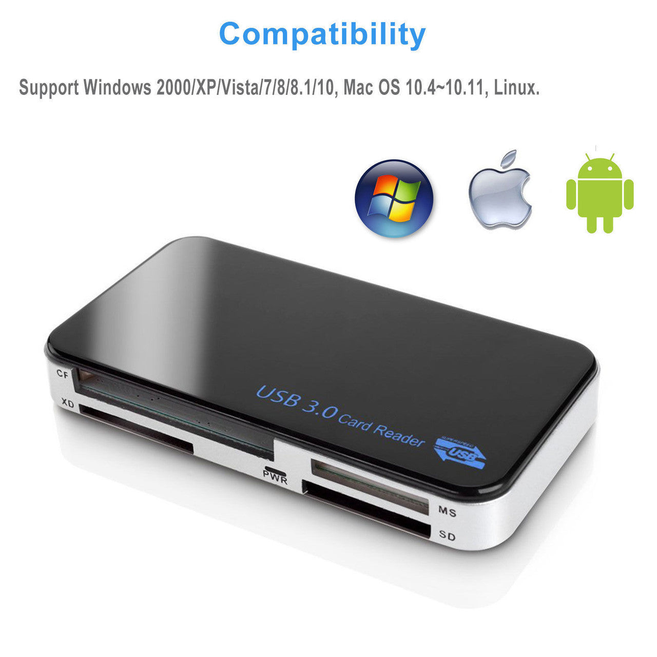A3: Yes, the card reader is compatible with multiple operating systems, including Windows 2000/XP/Vista/7/8/8.1/10, Mac OS 10.4~10.11, and Linux. It is also backwards compatible with USB 2.0 and USB 1.1.