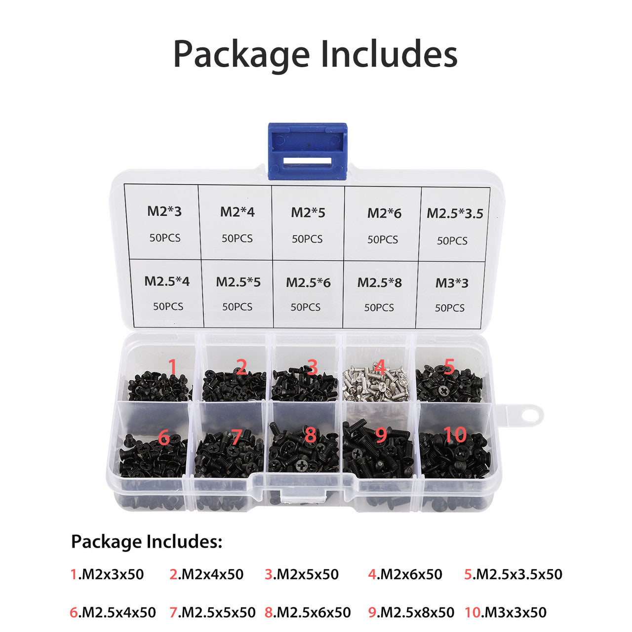 ✅Each Size 50pcs, total 500pcs in a handy plastic box.